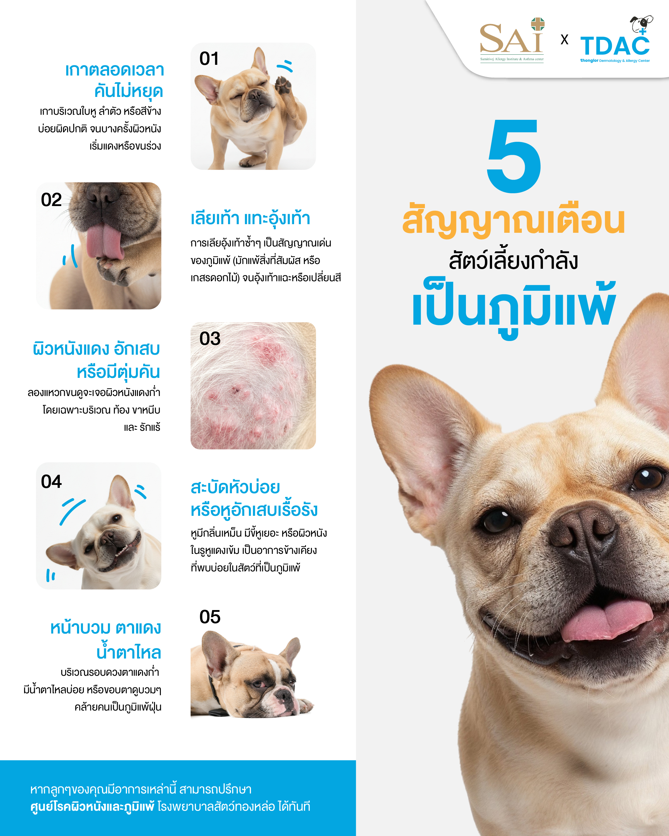 หากสัตว์เลี้ยงของคุณมีอาการเหล่านี้ เกิดซ้ำๆ เป็นเวลานาน หรือมีอาการรุนแรงขึ้น ควรรีบพาเข้ารับการตรวจจากสัตวแพทย์ด้านโรคผิวหนังและภูมิแพ้โดยเร็ว เพื่อหาสาเหตุที่แท้จริงและวางแผนการรักษาได้อย่างตรงจุด